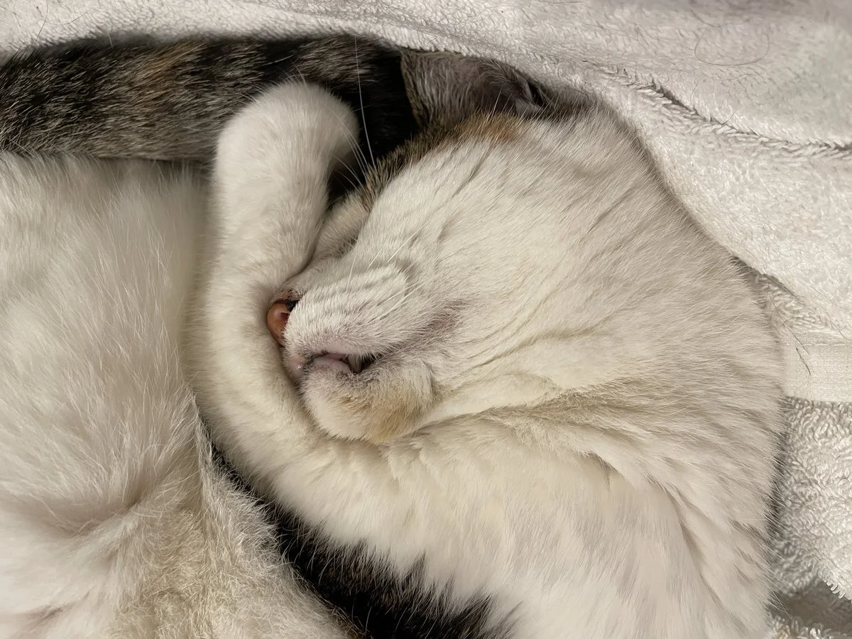 My father in-law always said that cats try to die alone, away from prying eyes. On the last day, Saturday, we awoke to her lying on the floor below the sofa where she had been lying. She probably tried to go to the bathroom. She was breathing and her eyes were alert but she was not moving. We put her back on the sofa and warmed her with blankets. She refused water or Chuuru. The kids and I sat with her all day. My wife was with her until 12:30 AM. After that she probably saw her chance to pass the way her adorable walnut brain told her a cat should, and did.
